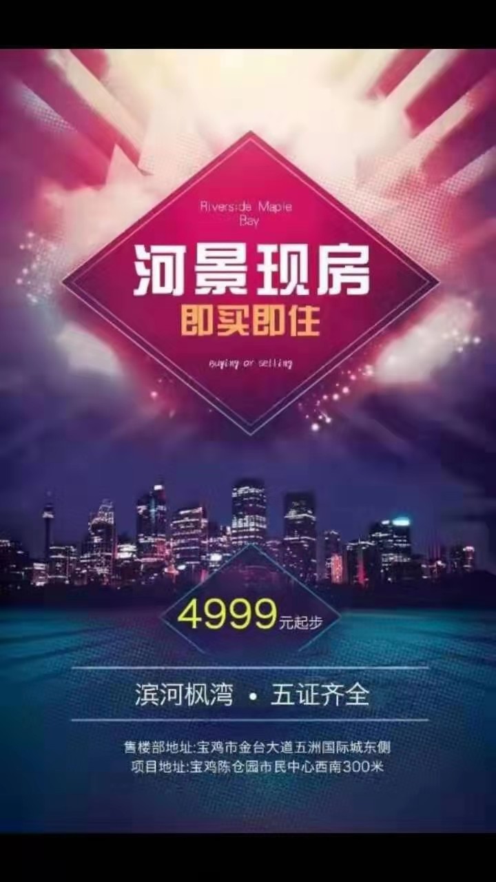 一.最美的河堤美景现房,12月将火爆宝鸡!4999元起五证齐全,即买即住,陈仓园商圈,中心中的中心,最高性价比,支持各种按揭(公积金,商贷均可) 滨河枫湾项目卖点: