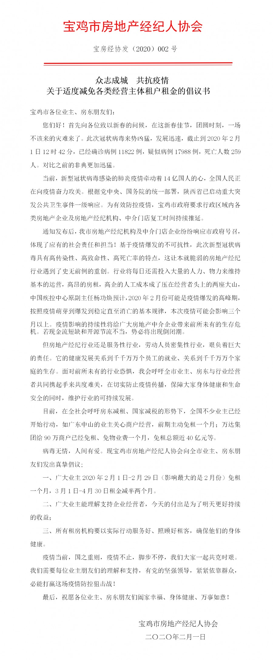 【众志成城 共抗疫情】关于适度减免各类经营主体租户租金的倡议书