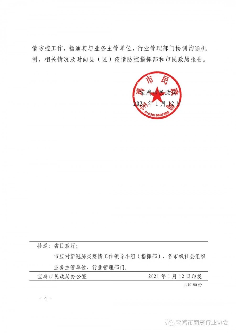 各会员单位: 当前,境外疫情加速蔓延,国内疫情点状散发,疫情防控形势十分严峻。又 值岁末年初,为防止人员大规模流动和集聚,造成疫情传播危险,进一步依 法科学精准做好新冠肺炎疫情常态化防控工作。各会员单位必须高度重视, 采取切实可行的措施,担负起社会责任。根据《宝鸡市民政局关于做好社会 组织领域疫情防控工作的通知》宝民发〔2021〕7号文件要求,希望各会员单 位和相关从业者重视起来做好疫情防控工作,为当前疫情防控工作做出应有 的贡献。 宝鸡市房地产经纪人协会建议春节临近之时,各会员单位特别要注意以下几 点,做好做扎实房产经纪行业的疫情常态化防控工作。谨防疫情滋生与扩 散。 一、严格落实佩戴口罩、测温验码、通风消杀、保持社交距离等常态化防控 措施,安全有序开展经营活动。特别强调经营场所从业人员和顾客务必佩戴 口罩。 二、安排专人关注顾客佩戴口罩情况,及时提醒和提示。并在店内通过海报、 电子屏、广播等宣传新冠肺炎防控知识和防控措施,引导消费者自觉配合落 实。 三、严格落实常态化防控指引和要求。各会员单位要遵照宝鸡市政府疫情防 控指示精神,不搞大规模、大型年会庆典、团拜、集体培训等活动,降低交 叉感染风险,保障市民健康安全。四、春节期间经纪行业从业人员尽量不离 开宝鸡,会员单位有外省员工的务必安排好外地员工的生活。加强员工防疫 培训,提升疫情防控能力,严格落实员工健康监测报告制度。 五、要培养员工树立“责任担当”的意识,养成勤洗手、戴口罩等良好卫生 习惯,严格遵守传染病防治法等相关法律法规。 总之,疫情防控是每个人的社会责任,希望各会员单位高度重视,严格落实 疫情常态化防控措施,维护我市社会经济发展秩序,保障人民生命健康,共 同守护我市的疫情防控成果。