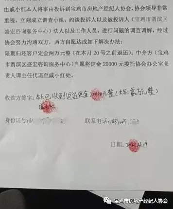 最后协会吴会长拿出来了《房地产经纪管理办法》,给双方详细讲解了相关法律法规,并且认真劝导中介方,作为经纪服务机构我们一定要以“诚信第一,服务至上”的原则为宗旨,对盛宏中介的不当行为进行了批评指正,以《房地产经纪管理办法》第11条、第16条、第19条、第20条和第24条之规定说服教育,盛宏中介在明确严重违反规定并造成不良后果后,表示愿意听从协会调解,积极配合协会的处理决定,保证后期业务一定规范操作。并与当事人达成友好协商,并承诺和房东沟通后,最晚于2021年4月20日前退还客户贰万元(¥20000)定金,此次投诉事件得到圆满解决。盛宏中介负责人激动地说:“多亏有组织存在,要不然都不知道在哪处理,怎么处理?” 盛宏中介在处理结果上签字: